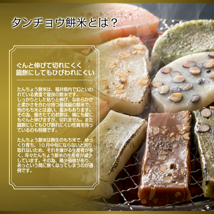 福井県産たんちょうもち米と、うるち米を1:1でお搗きしたお餅になります。