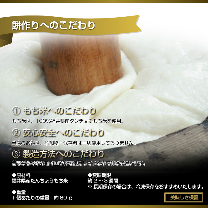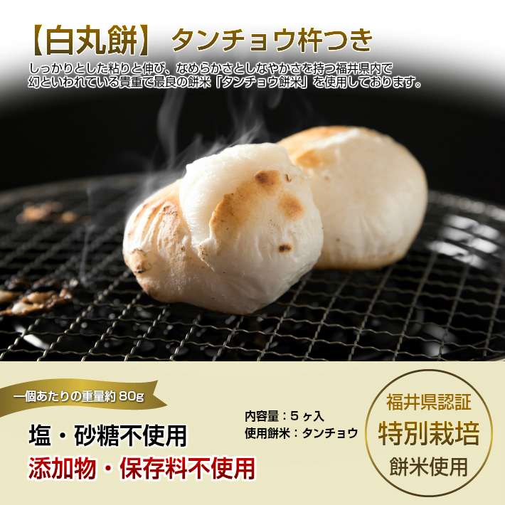 この丸餅は、福井県産の幻のもち米「タンチョウ」を使用したことで、驚くほど良く伸び、舌触りも滑らかで、雑煮や焼きもちにしても本当に美味しいお餅としてお楽しみいただけます。
